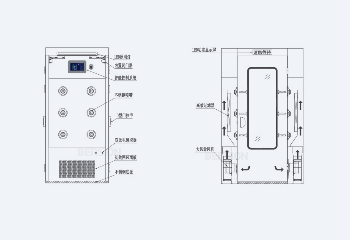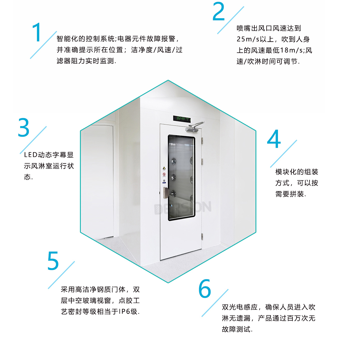 Der-1系列智能控制系统 10寸电容触摸液晶屏,ARM主控,多核CPU,高速主频; 语音提示,吹淋时间0-99S可调,双门电子互锁,PDF/JPG图片、视频多种文件播放功能; 多种场景功能程序,可根据需求自行选择,且带密码权限设定; 智能判断各部件连接状态、运行状态及故障自检功能,且可接入中央整厂监控系统; 可选配风速、压差、尘埃多种传感器,预留各模块接口; |